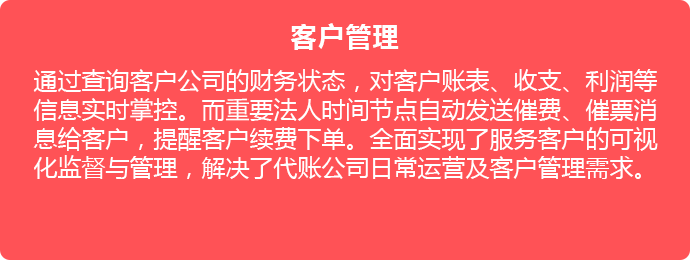 客户管理系统主要是解决代理记账公司的客户管理、账务管理,税务管理的整体解决方案,实现客户管理的营销、公司注册注销等多项业务办理进度监控客户推送、客户标签、客户关联、客户转介绍、客户收费、客户代收款、一般纳税人小规模税务风险管控、代账公司预算管理、员工绩效考核、员工培训、工资考勤等模块。